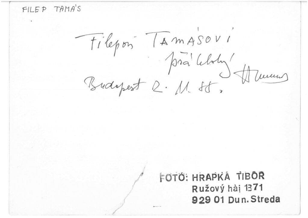 Amikor az OSZK-ban, Thomka Beáta Mészöly-monográfiájában megláttam Hrabal és Mészöly kiállítási képét, ingyen sem gondoltam volna, hogy másnap reggel, rögtön ébredés után kiolthatatlan kíváncsiság támad bennem a képsorozat iránt. A boríték a helyén, érintetlenül, több cellux-csíkkal átragasztva, ahogy Dunaszerdahelyen útjára bocsátották. Feltépem, kibontom; kiveszem a képeket. A szemem sarkából látni vélem, hogy valami papírdarab pilinkézik belőle a padlószőnyegre. Nézegetem, rakosgatom a képeket, megörülök az ismerősöknek, barátoknak, az irodalmi-művészeti-tudományos élet nagyjainak.