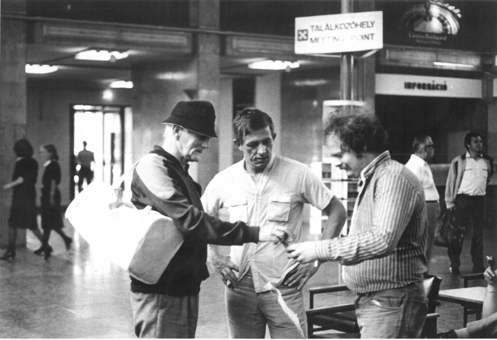 Az egyik képnél megállok, hökkenten nézem. Arra végképp nem emlékeztem, hogy egy Nobel-díjas magyar író is ott volt a díszes vendégseregben. Persze akkor még nem volt az, a plecsnit „csak a múlt héten” kapta meg. 1986-ban még egy- vagy kétkötetes pályakezdő – akkoriban az ilyeneket „ígéretes tehetség”-nek nevezték –, a Sátántangó sikere után. Az egyik fotón Hraballal és Mészöllyel beszélget az utcán, gondolom, valahol az Eötvös Klub előtt. A másodikon is. Nem beszélve a harmadikról. Ide elég lesz közülük egy is.